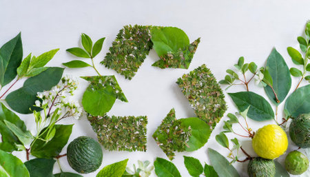 A visually striking green recycling symbol made from intricate leaf patterns and nature-inspired elements on a pristine white background. Ideal for promoting sustainability, green initiatives,