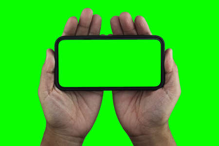 mobile phone with green screen. Mens hands
