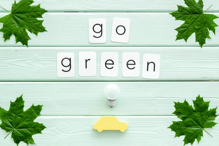 Go green concept with maple leaves, car and lamp and copy on mint green wooden background top view