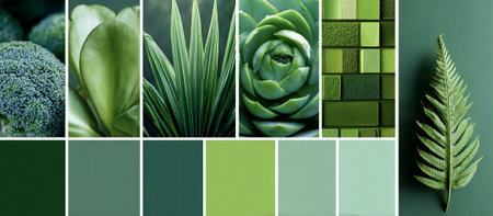 A vibrant green color palette composed of natural elements, including plants and vegetables, highlighting diverse textures and shades for creative design projects, AI generated