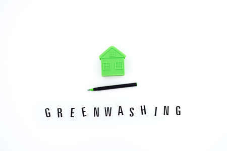 Greenwashing concept with green and black pen and plastic house. Greenwashing marketing ploy products seem more sustainable and environmentally friendly than they are.