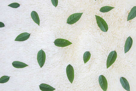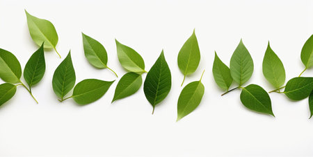 A collection of green leaves of varying sizes is elegantly arranged on a soft mint-colored background, showing the beauty of nature in a serene and harmonious setting.