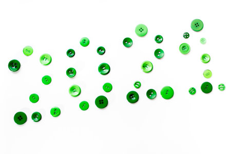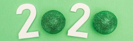 top view of white 2020 numbers with christmas baubles on green background, panoramic shot