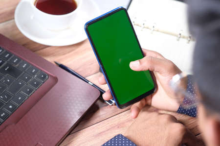 Confident businessman hands holding smartphone text closeup. Chroma key screen. Unrecognized man financial manager walking use phone in suit. Relaxed agent communicate with client online. Remote work
