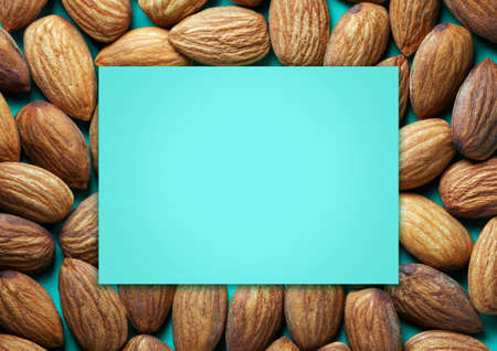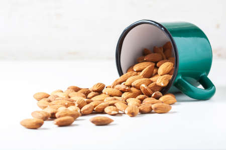 Healthy food for background image close up almond nuts. Texture on white grey table top view.