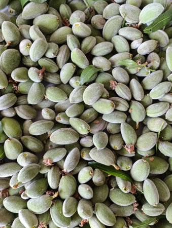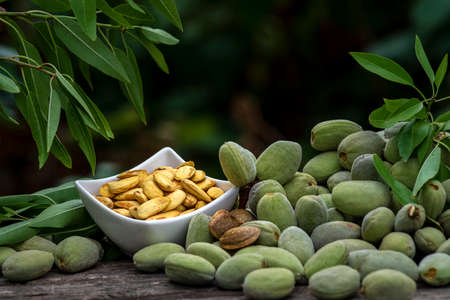 Green almonds background fresh raw unripe wooden rustic table blurred garden background leaves, Top view concept with copy space shell tree branch frame without shell peeling white Bowl