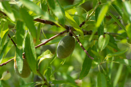 Green almonds nuts ripening on tree in summer, cultivation of almond nuts in Provence, France
