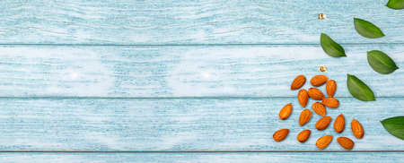 Almonds scattered on the wooden vintage table. Almond is a healthy vegetarian protein nutritious food. Almonds on rustic old wood