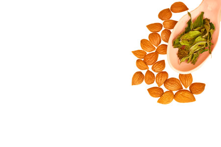 Top view of almonds with leaves isolated on white background with clipping path and full depth of fi