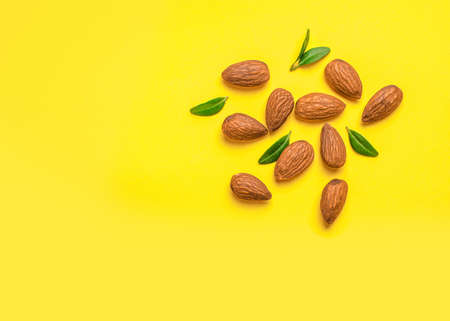 Almond nuts with leaves on yellow background. Top view. Copy space.