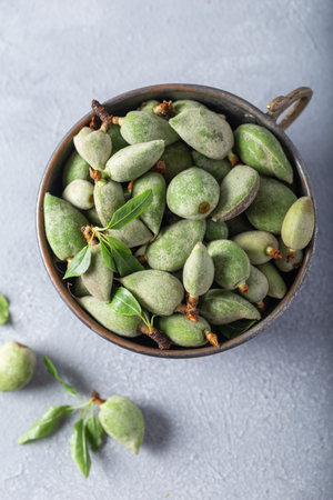 Fresh unripe almonds on the wooden background. Fresh raw green almonds in the metal bowl. Top view.