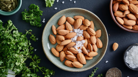 A beautifully arranged plate of roasted almonds with a sprinkle of sea salt, surrounded by fresh herbs and spices, perfect for a healthy snack display.