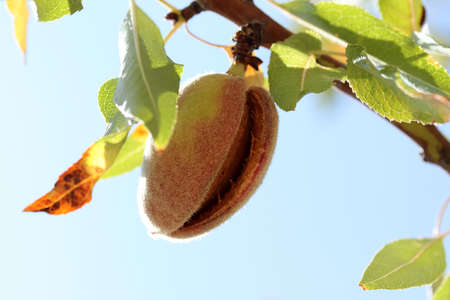 Green almond nuts ripening on tree, nature background with blue sky copy space