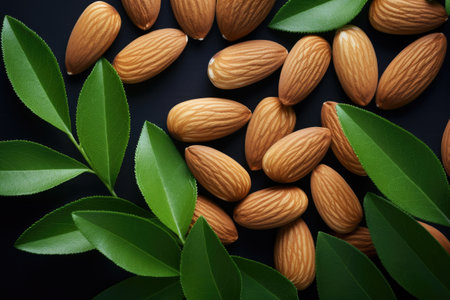 Almonds scattered on a black table. Almond is a healthy vegetarian protein nutritious food. Natural nuts snacks.