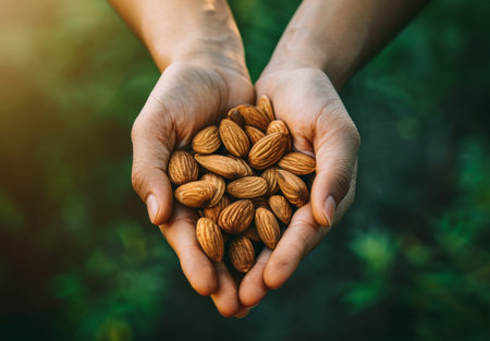 Almond in hand. Man holding fresh nut. Organic bean ingredient. Closeup pile of vegetarian food. Vegan raw protein fruit