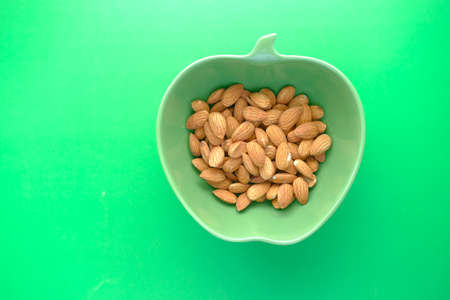 Fresh natural healthy almonds nuts in heart shaped bowl on mint background. Top view.