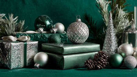 A symmetrical green-and-silver composition ideal for festive product display.
