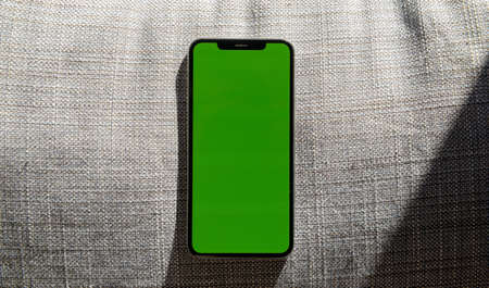new smartphone telephone with green screen over the gray garment texture - ready to insert your own text in the green part