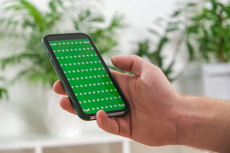 Man holding smartphone in garden with green screen