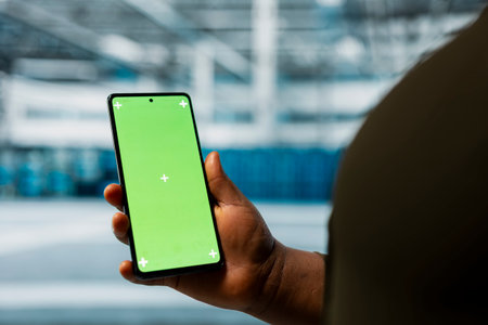Close up of data center admin using green screen smartphone to monitor infrastructure network performance. Server room employee checks gear functionality using mockup mobile phone