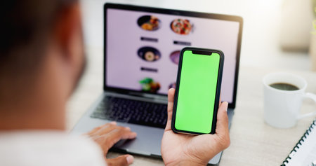 Phone, laptop food menu and man scroll on sushi restaurant website, ecommerce homepage and search for takeaway delivery. Mobile green screen, mockup product placement and customer online shopping