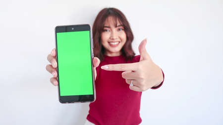 Asian beautiful girl point on green screen phone with with blurry background on face in white background