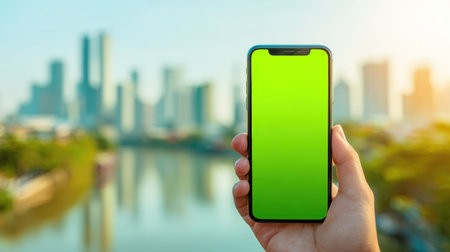 Hand Holding Smartphone with Green Screen Against Blurred City Skyline