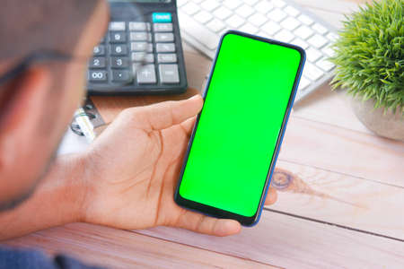 hand of man holding mobile smart phone with chroma key green screen on gren background