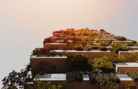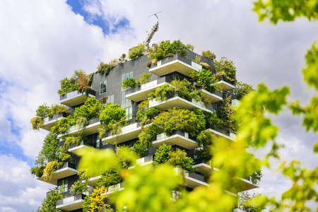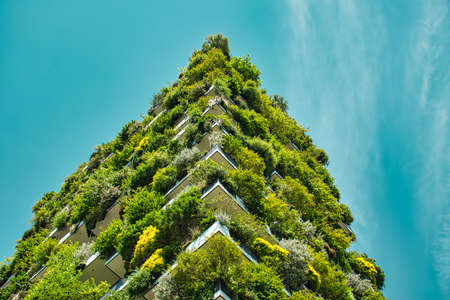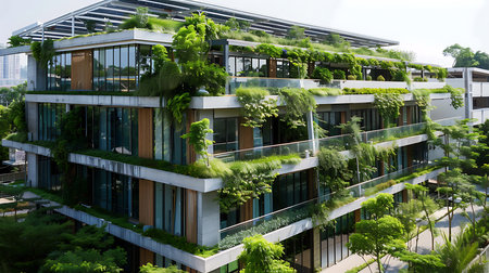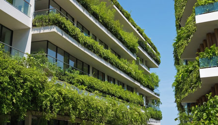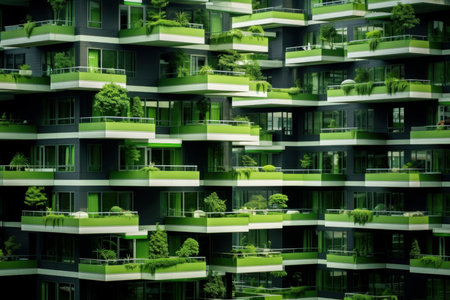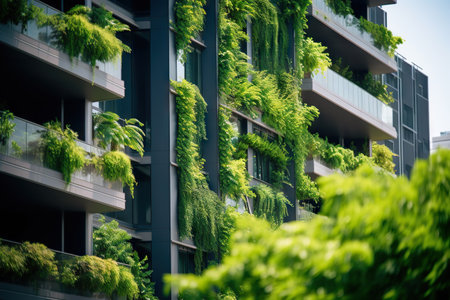 Eco-friendly living: the facade of a modern urban apartment building is decorated with lush green plants and trees