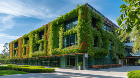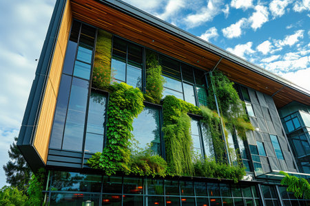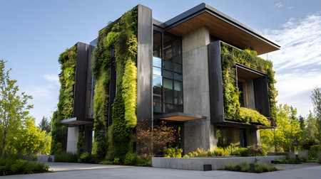 Lush green plants growing on the facade of a modern building, showcasing sustainable architecture and eco-friendly design
