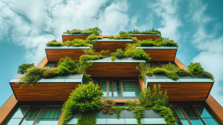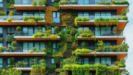 Architectural detail of an eco-friendly residential building with balconies lush with integrated greenery and sustainable design. AIG41