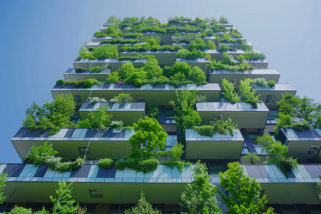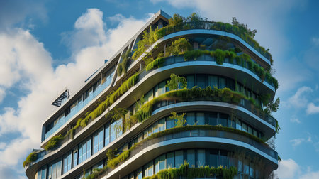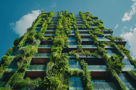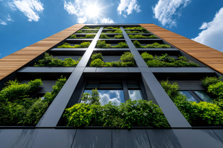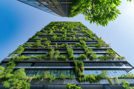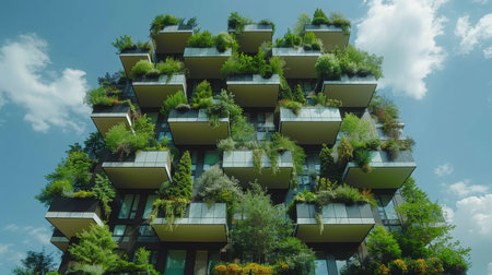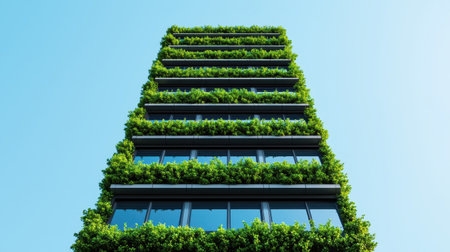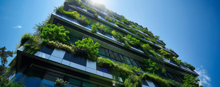 Modern vertical garden building with lush greenery, blue sky and glass windows creating an eco-friendly urban environment and sustainable architecture
