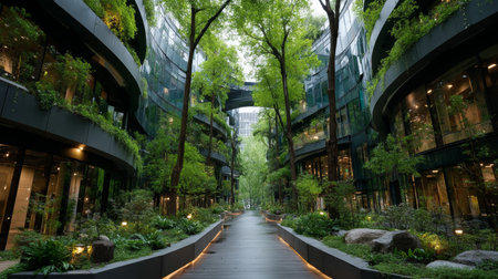 Corporate headquarters designed with green infrastructure, featuring eco-friendly buildings surrounded by lush vertical gardens