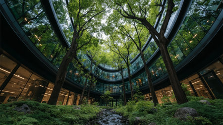 A modern corporate office designed with sustainability in mind, featuring extensive glass architecture, greenery, and innovative technology that harmonize with the environment.