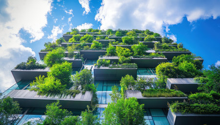 A modern skyscraper with lush greenery adorning its facade, reaching toward a bright blue sky dotted with fluffy clouds.
