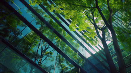 Modern glass building facade reflecting green trees in urban environment