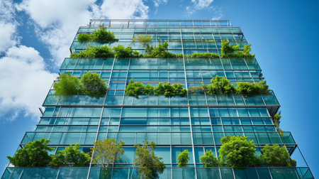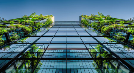 green plants and garden on modern glass skyscraper office building, nature and contemporary architecture, balance and harmony of environment and human, sustainability of ecosystem. High quality photo