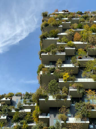 MILAN , ITALY 10 JUNE 2018 : modern building that houses numerous trees and plants in the balconies. green economy and environmental care in modern architecture