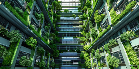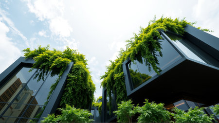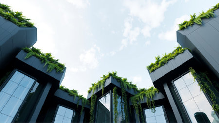 Low-angle shot showcasing vertical gardens and plant life integrated within modern buildings. Urban design blends nature seamlessly with architecture. Bright, sustainable building facade.