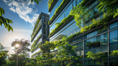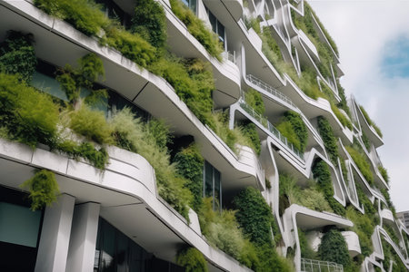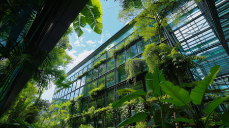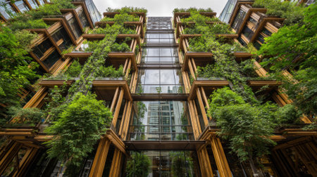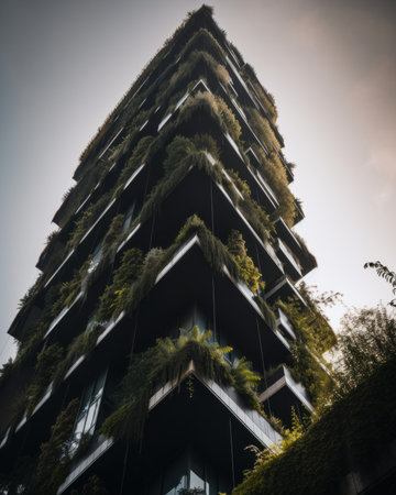 Experience the harmonious blend of nature and architecture in this captivating image of green architecture. Witness a skyscraper building adorned with plants growing on its facade, creating a vertical green oasis that breathes life and beauty into the urban environment.