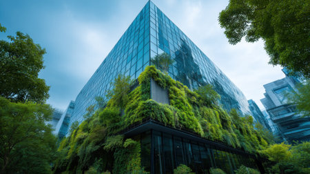 Modern Glass Office Building with Green Facade in Urban Environment.