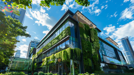 A contemporary office building featuring lush vertical gardens and eco-friendly architecture under a clear blue sky. AIG41