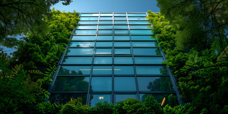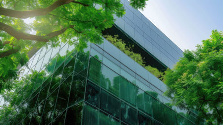 Modern glass building surrounded by lush greenery for sustainable business architecture