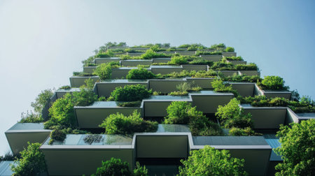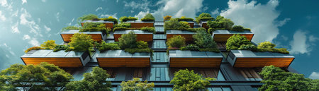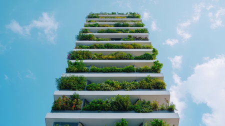 Modern eco-friendly skyscraper featuring lush green vegetation on balconies, highlighting sustainable and innovative architecture. Promotes urban greenery and environmental consciousness.