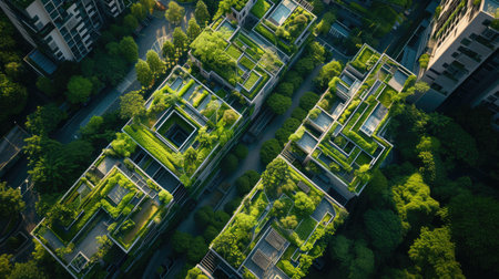 Aerial view of a modern building complex with extensive green roofs, showcasing sustainable architecture and urban greenery.