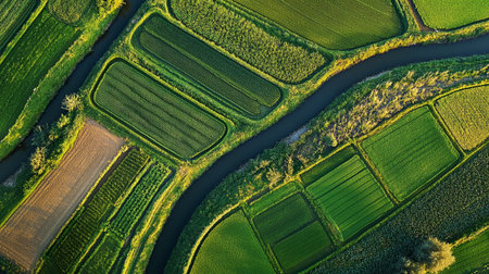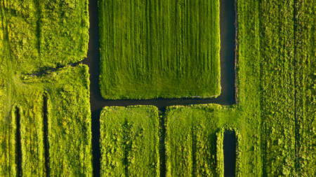 Aerial view of green field. Netherlands. Canals with water for agriculture. Fields and meadows. Landscape from a drone.