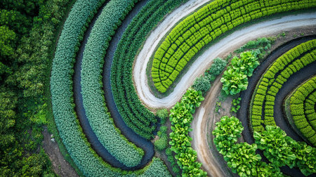 Aerial top view of green tea plantation, nature green background.