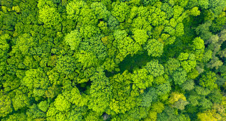 Aerial view spring forest. Natural green background. Photo from the drone