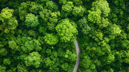 Aerial view of green forest. Top view of green forest with road