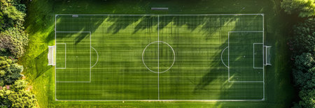 Aerial View of a Soccer Field Surrounded by Trees on a Sunny Day. Concept of Outdoor Sports, Team Games, Nature, Recreation. Wide banner.